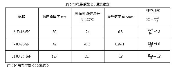 數(shù)據(jù)分析:(表4)胎面膠145℃熱傳速度。胎面膠厚度2cm,時傳熱平均速度為20/20=1min/mm,當胎面膠厚度增加到20cm時熱傳平均速度提高到1500/200=7.5min/mm,這種現(xiàn)象主要由于橡膠是不良導體,導溫系數(shù)小傳熱時間長,升溫慢,導致溫度滯后損失。在計算方面如何解決輪胎測算數(shù)據(jù)準確問題。從輪胎的負荷能力推斷,負荷越大,輪胎幾何尺寸成正比。用K1與簾布層數(shù)聯(lián)系地來考慮,以布層數(shù)為計算系數(shù)的基數(shù)。根據(jù)測算建立布層系數(shù)通式(表5)。