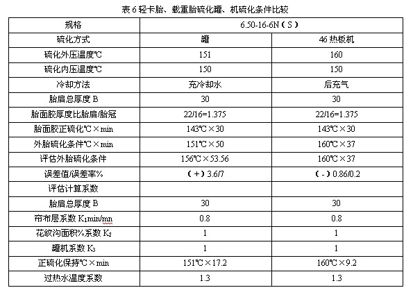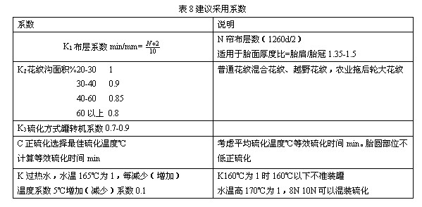 用級量法評估計算外胎硫化條件。輕卡胎、載重胎(表6),工程胎、農(nóng)業(yè)胎(表7)外胎硫化條件誤差率多數(shù)5%以下,證明方法基本可行。建議采用系數(shù)(表8)。
